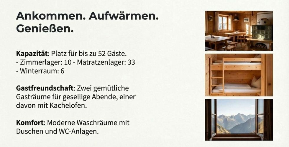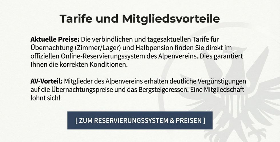 Berg- und Schutzhütte • bewirtschaftet • OeAV • 10 Zimmerlager/Betten • 33 Matratzenlager • 6 Winterraum