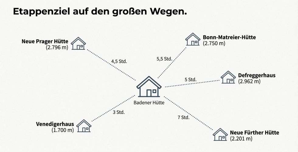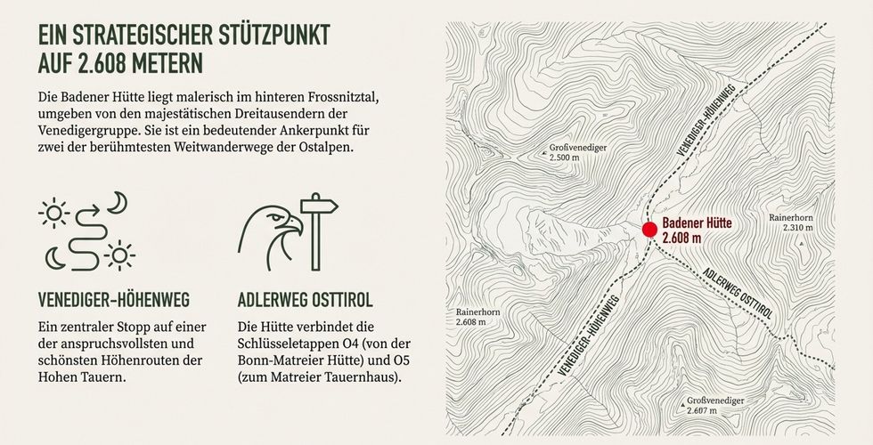Die Badener Hütte (2.608 m) ist eine bewirtschaftete Schutzhütte des Österreichischen Alpenvereins (OeAV) und ein bedeutender Stützpunkt auf dem Venediger-Höhenweg und dem bekannten Adlerweg. Sie liegt malerisch im hinteren Frossnitztal in der östlichen Venedigergruppe, umgeben von beeindruckenden Dreitausendern, darunter der majestätische Großvenediger. Hier erwartet Sie eine unvergessliche alpine Erfahrung.