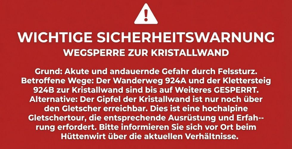 ACHTUNG: Wegen Felssturz ist der Wanderweg 924B (Klettersteig) und 924A Kristallwand gesperrt!. Siehe: Felssturz zerstört Wege auf die Kristallwand Alpenverein Gipfel Kristallwand nur über Gletscher!