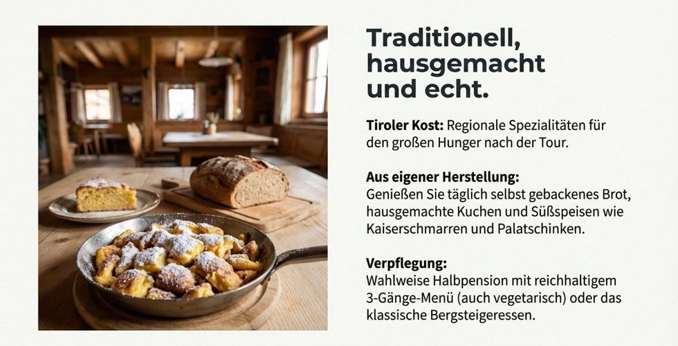 Die Hütte ist familienfreundlich und bietet Platz für bis zu 52 Gäste. Genießen Sie hier selbst gebackenes Brot, hausgemachte Kuchen, Tiroler Spezialitäten, Kaiserschmarren und Palatschinken.