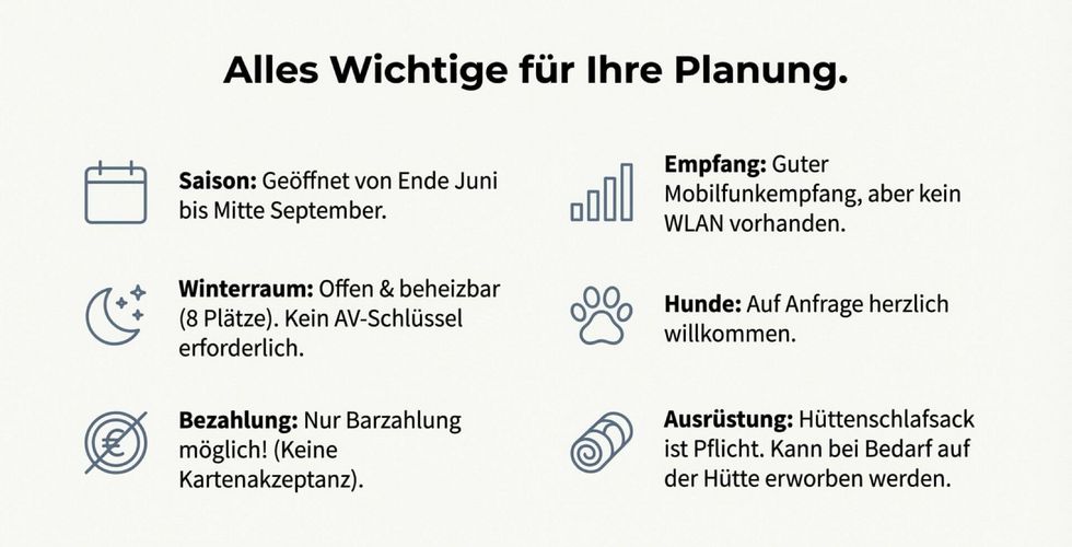 Die Hütte ist von Ende Juni bis Mitte September geöffnet. Ein beheizbarer Winterraum steht außerhalb der Sommersaison zur Verfügung.
